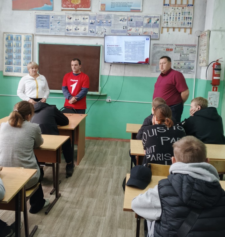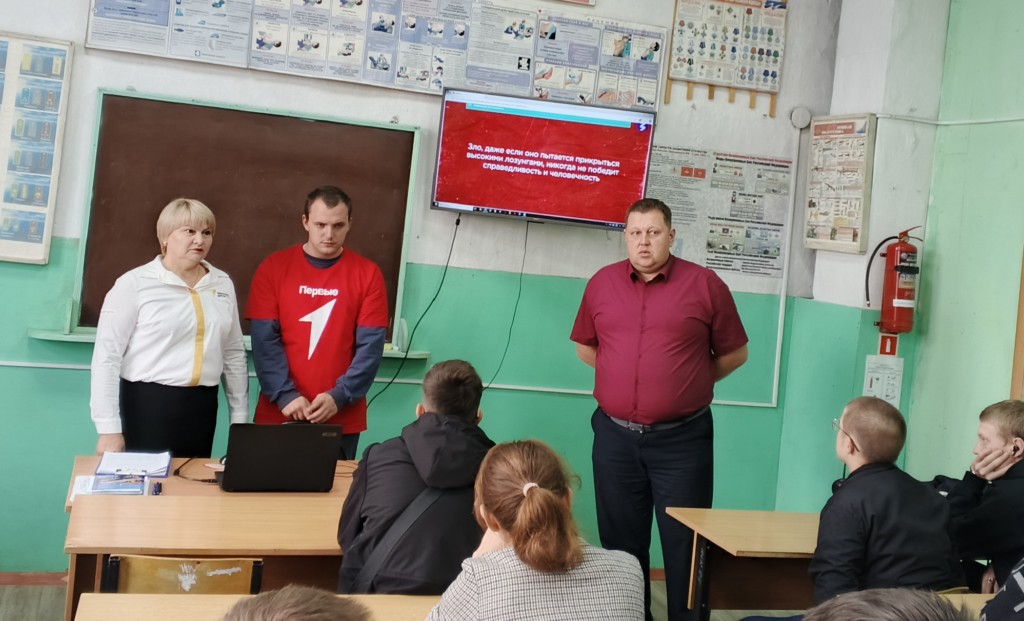 В Профессиональном училище № 58 р.п. Юрты советник директора по воспитанию и взаимодействию с детскими общественными объединениями Зиновкина С.В., преподаватель истории Поздняков А.А.и актив студентов в формате классного часа провели для студентов первого курса лекцию «Геноцид советского народа».